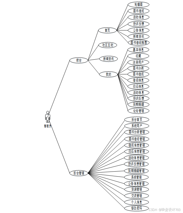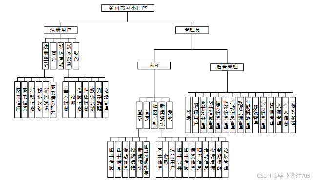 通过对乡村书屋小程序的需求分析,该系统主要分为注册用户和管理员两大功能模块。具体如下: