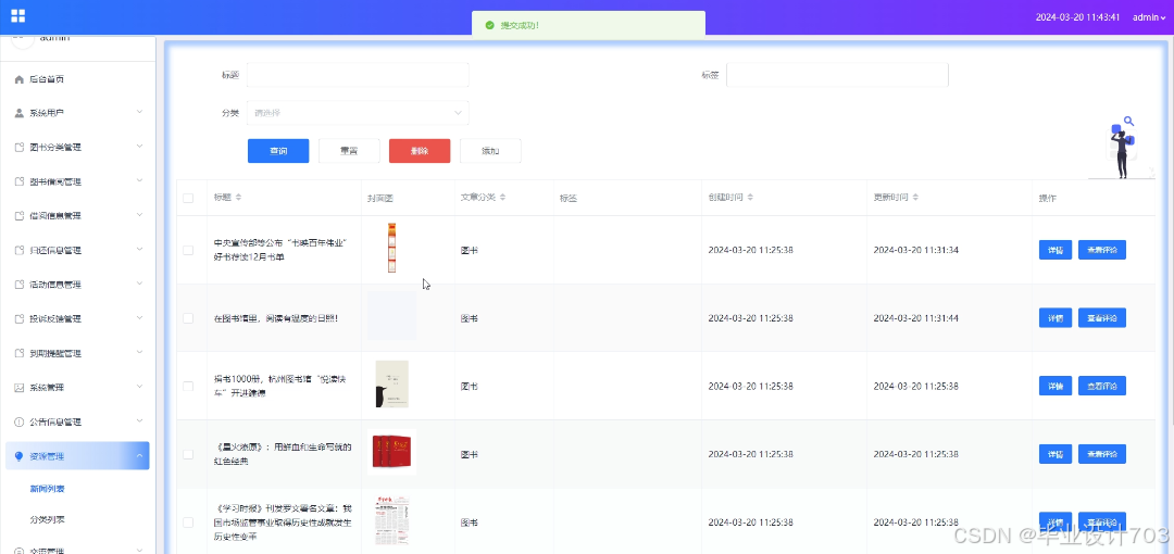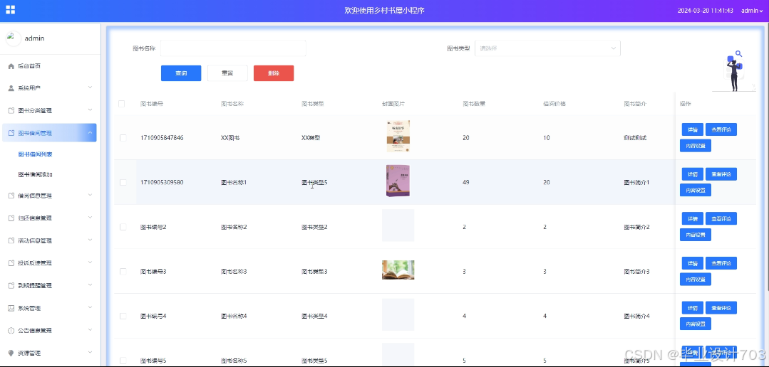 - 图书借阅管理:可查看所有图书借阅信息,进行增改删查操作,支持图书名称、图书类型搜索,点击可查看详情和查看评论,并可点击进行内容设置。