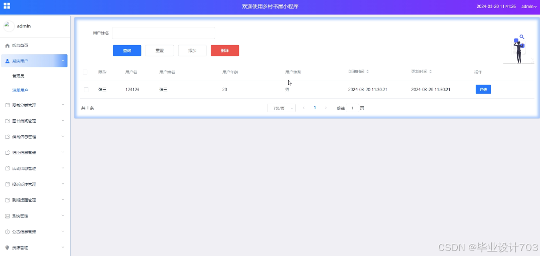 - 系统用户:可对注册用户和管理员进行管控,包括进行增删改查操作,点击可查看详情。