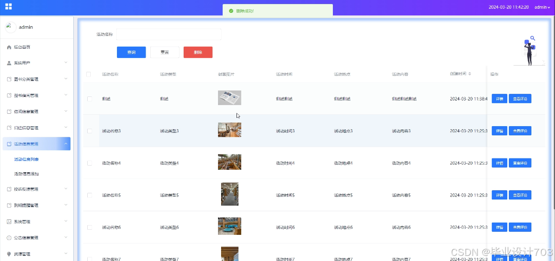 - 活动信息管理:可查看所有活动信息信息,进行增改删查操作,支持活动名称搜索,可点击查看详情和查看评论。