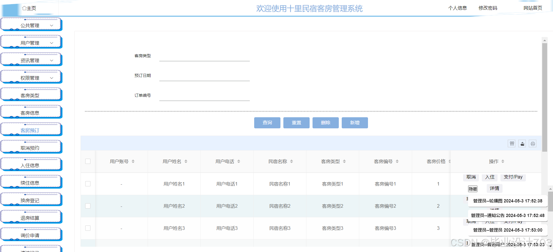 - 客房预订:管理员可以对所有客房预订信息进行管控和查看其信息详情,可以进行增删改查操作,支持客房类型、预订日期、订单编号搜索,并可点击取消、入住、支付等操作。