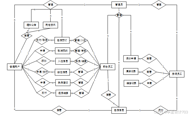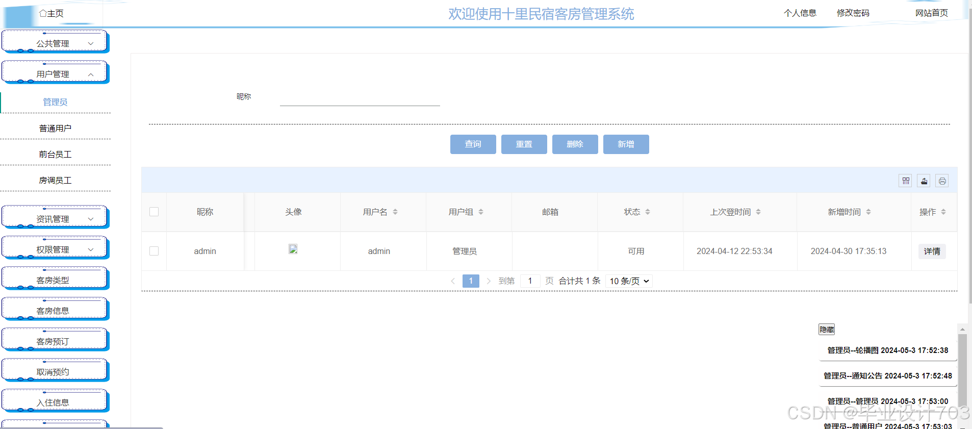 - 用户管理:管理员可以对普通用户、前台员工、房调员工和管理员等系统用户信息进行管控和查看其信息详情,可以进行增删改查操作;前台员工账号信息由管理员添加。