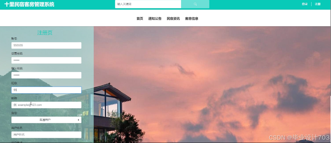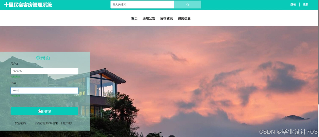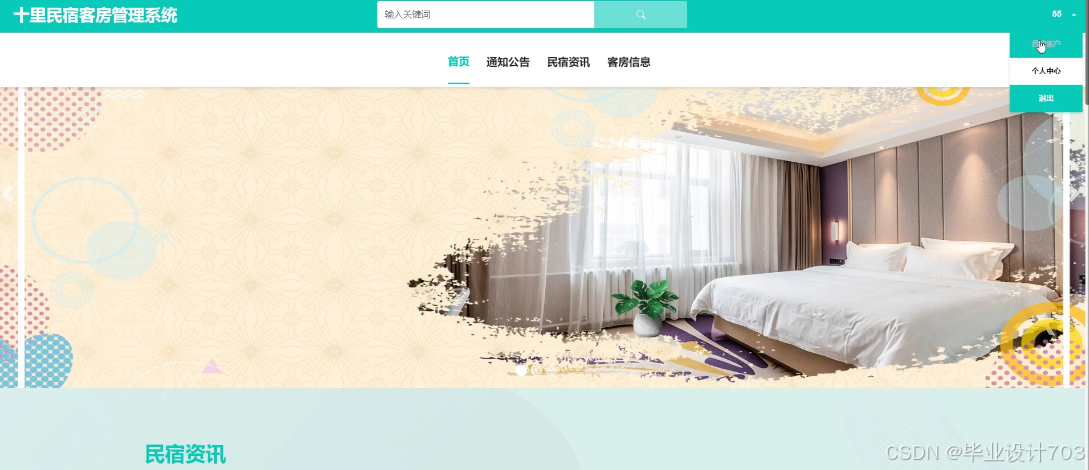 - 首页:普通用户登录系统前台后首先进入首页界面,可以查看轮播图、通知公告、民宿资讯等信息,并可以使用系统其他功能。
