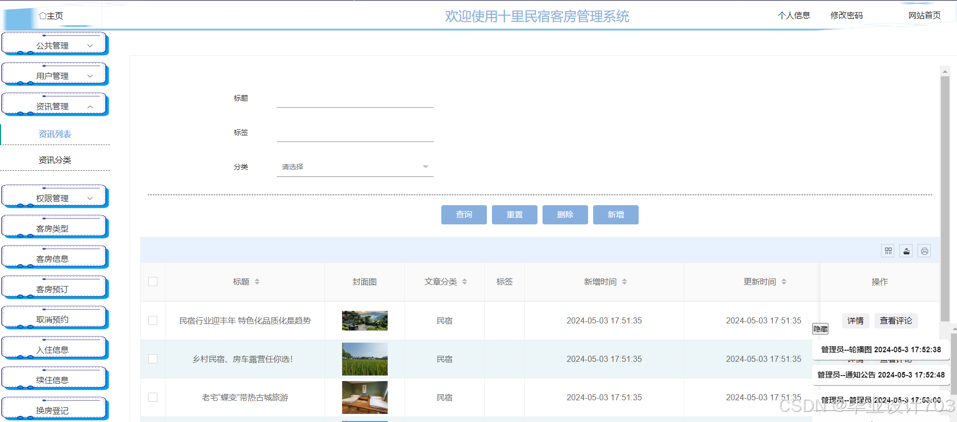 管理员可以对民宿资讯和资讯分类信息进行管理和查看其信息详情,进行增删改查操作,民宿资讯支持标题、标签、分类搜索,并可以查看评论信息;资讯分类支持频道名称搜索。界面如下图所示。
