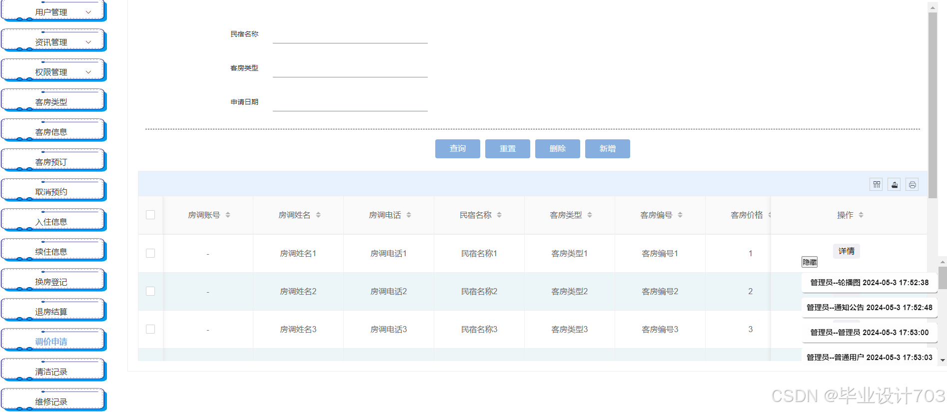 - 换房登记:管理员可以对所有换房登记信息进行管控和查看其信息详情,可以进行增删改查操作,支持客房类型、换房日期搜索。
