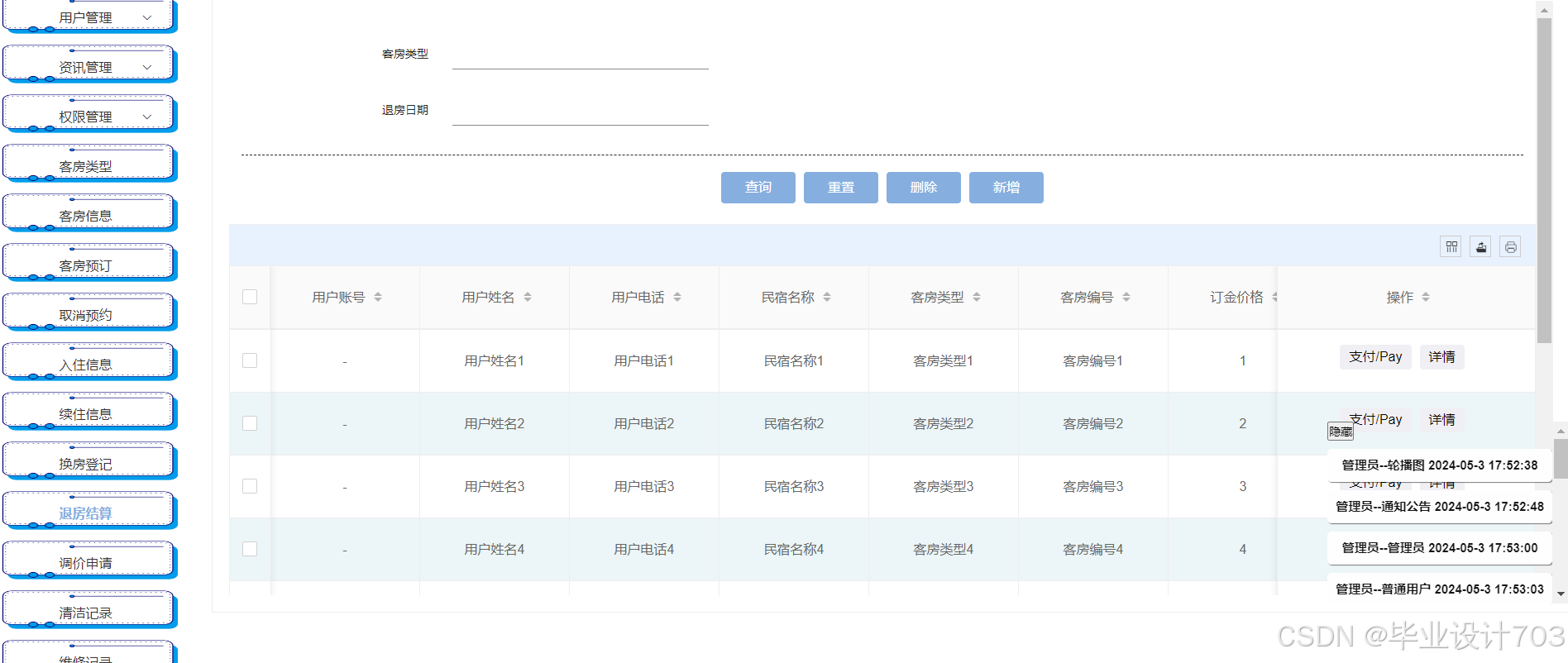 - 续住信息:管理员可以对所有续住信息进行管控和查看其信息详情,可以进行增删改查操作,支持客房类型、续住日期、续住订单搜索,并可点击支付操作。