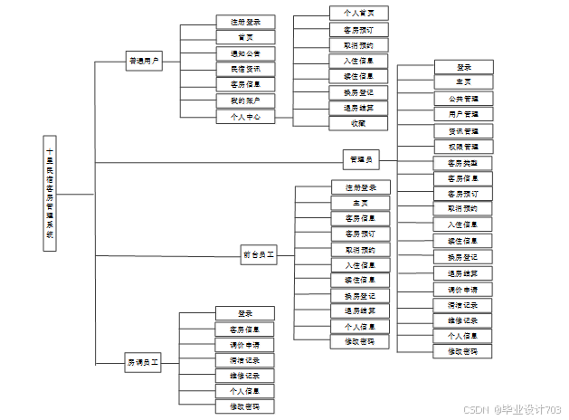 通过对十里民宿客房管理系统的需求分析,该系统可以划分为普通用户模块、前台员工模块、房调员工模块和管理员模块。以上模块又可以划分为不同的功能分组,功能模块说明具体如下: