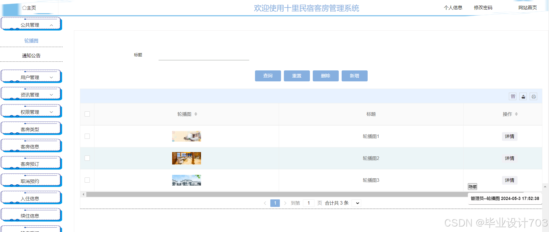 管理员可以对首页的轮播图、通知公告进行管理和查看其信息详情,可以进行增删改查操作,支持标题搜索。界面如下图所示。