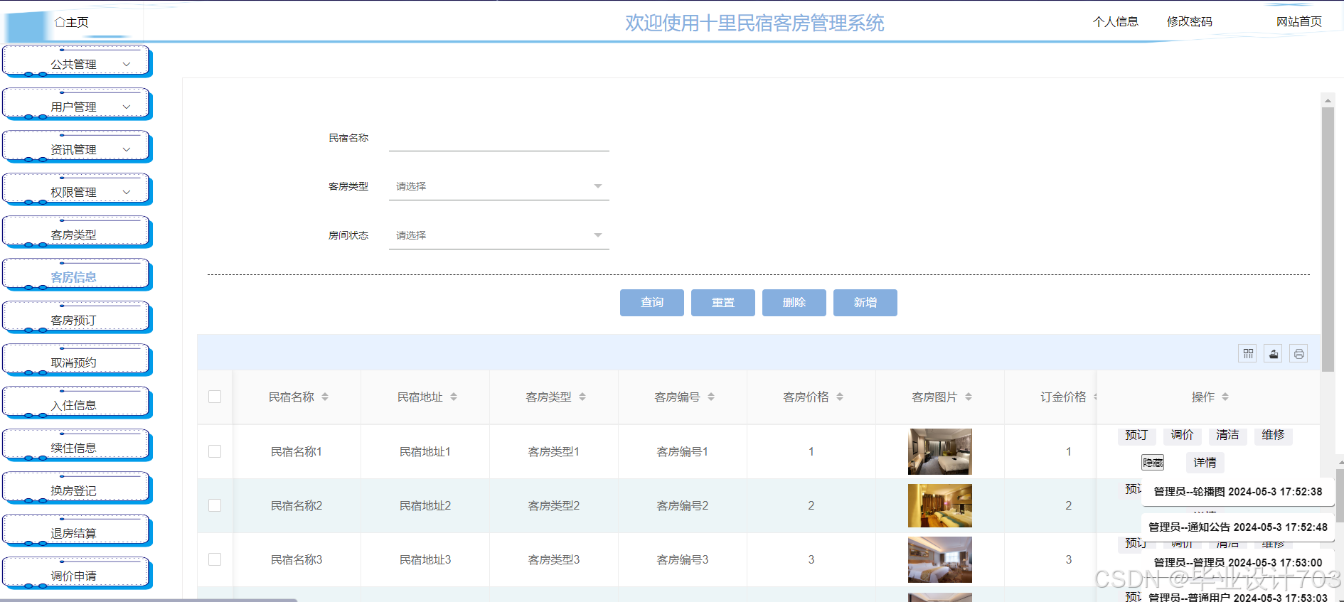 - 客房信息:管理员可以对所有客房信息进行管控和查看其信息详情,可以进行增删改查操作,支持民宿名称、客房类型、房间状态搜索,可查看评论信息详情,并可点击预订、调价、清洁、维修等操作。