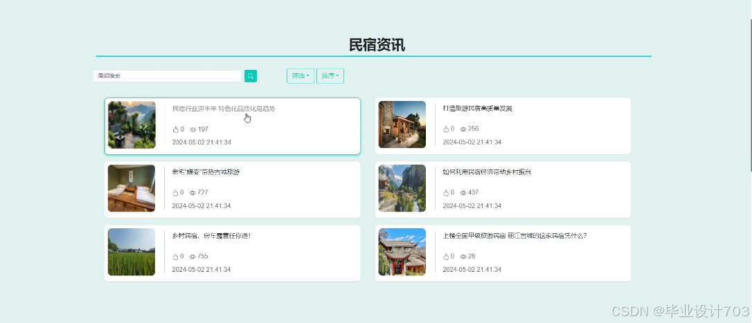 普通用户可以查看发布的所有民宿资讯信息详情,支持局部、筛选、排序搜索,同时支持热门文章推荐,进行点赞、收藏和评论。界面如下图所示。
