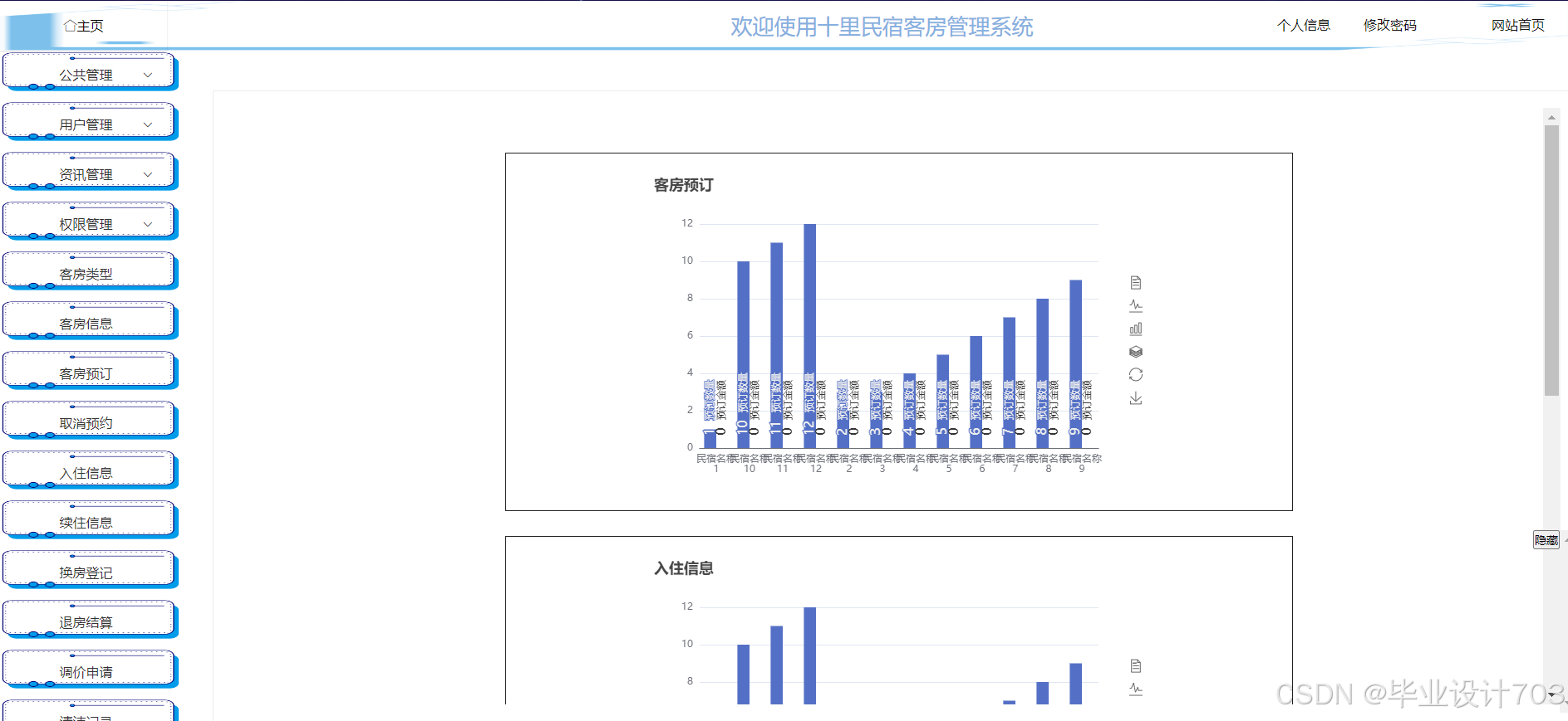 - 主页:管理员登录系统后,首先进入主页界面,可查看客房预订、入住信息等统计信息数据统计分析图表。