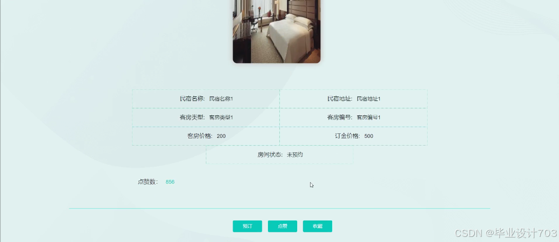 - 客房信息:普通用户可以查看发布的所有客房信息详情,支持民宿名称、客房类型、房间状态、排序搜索,进行点赞、收藏和评论,并可以点击预订操作。