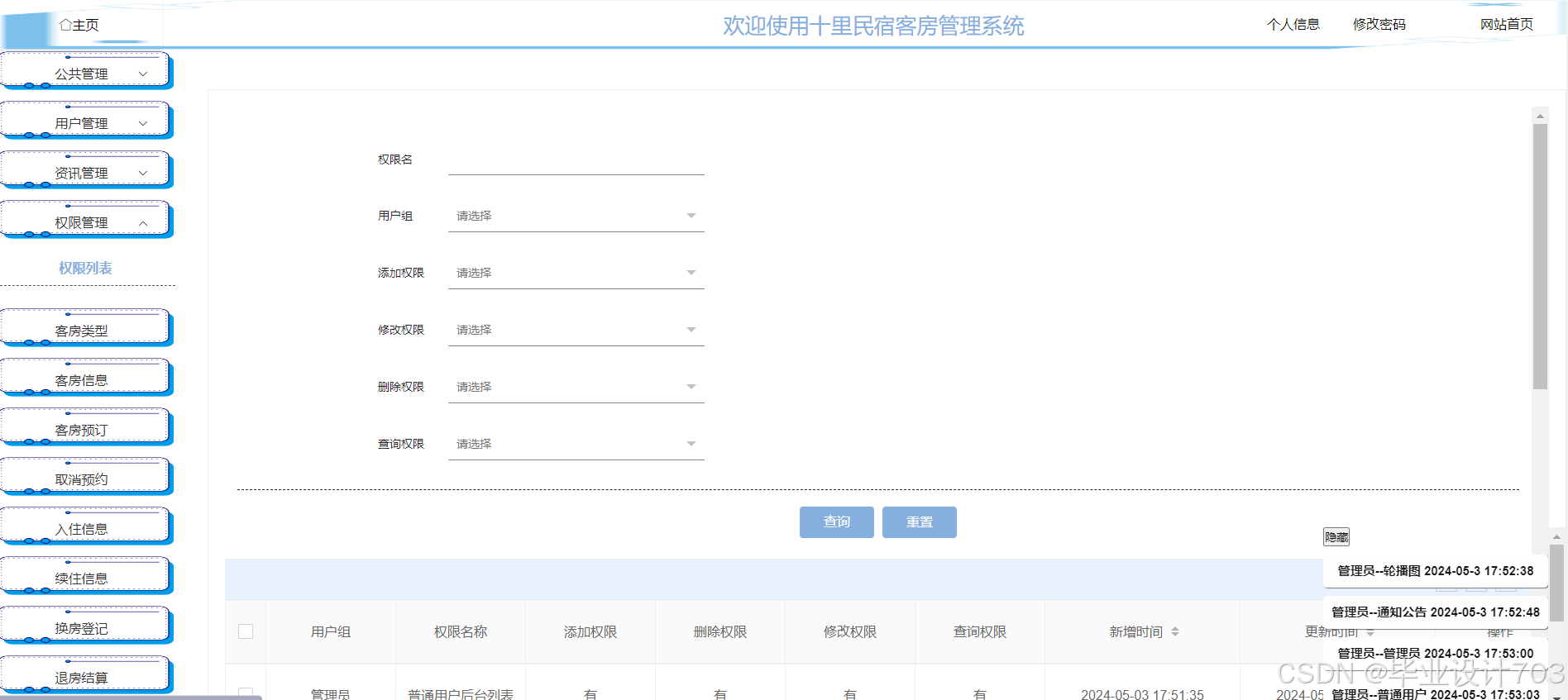 本次毕业论文主要是利用php技术开发一个安全可靠,操作简易,同时具备业务可扩展的十里民宿客房管理系统。本文详细的论述了系统的设计和开发,本系统的所有事务逻辑都是按照系统的需求分析进行设计的,系统普通用户、前台员工、房调员工和管理员四大角色,主要完成运行了公共管理(轮播图、通知公告)、用户管理(普通用户、前台员工、房调员工和管理员)、资讯管理、权限管理、客房类型、客房信息、客房预订、取消预约、入住信息、续住信息、换房登记、退房结算、调价申请、清洁记录、维修记录等功能。