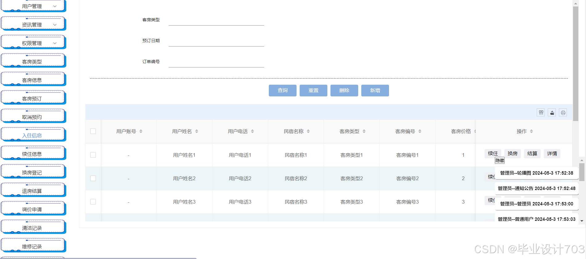 - 入住信息:管理员可以对所有入住信息进行管控和查看其信息详情,可以进行增删改查操作,支持客房类型、预订日期、订单编号搜索,并可点击续住、换房、结算等操作。
