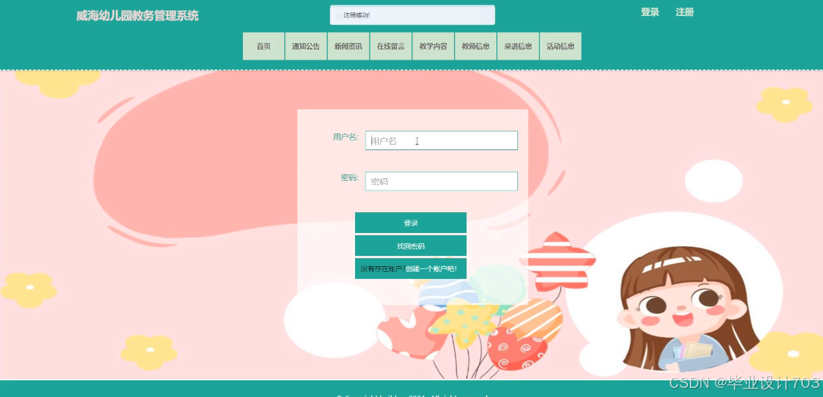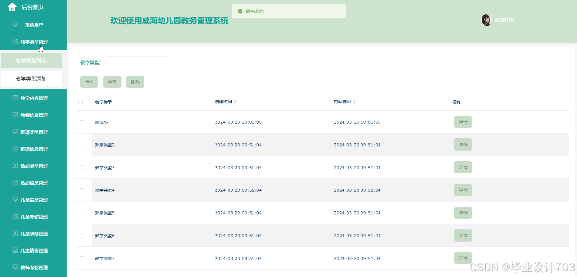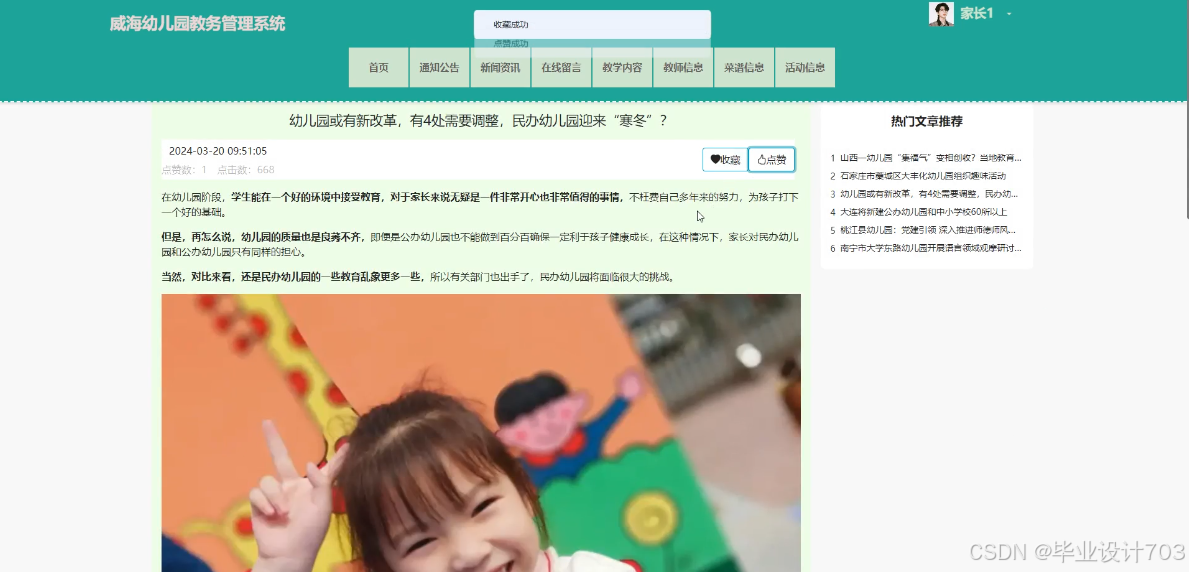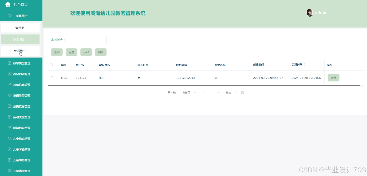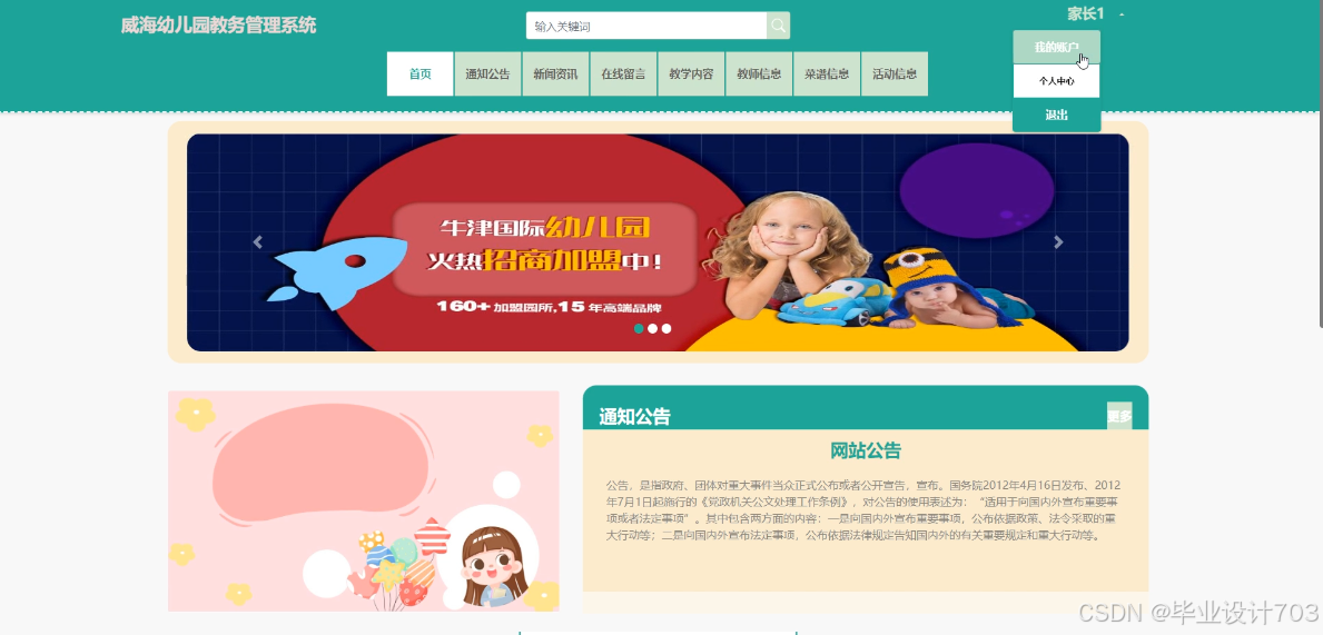 The main users of the Weihai Kindergarten Academic Management System are divided into administrators, teacher users, and parent users. The implementation functions include administrators: system users, teaching type management, teaching content management, teacher information management, recipe type management, recipe information management, activity type management, activity information management, child information management, child attendance management, child affairs management, child leave management, teacher attendance management, system management, message management, notification announcement management, resource management, etc. Teacher users: teaching content management, teacher information management, recipe information management, activity information management, child information management, child attendance management, child affairs management, child leave management, teacher attendance management, etc. Parent users: homepage, notification management, teacher attendance management, etc. Announcements, news, online messages, teaching content, teacher information, recipe information, activity information, my account, personal center, and other functions. Due to the comprehensive design of the functional modules on this website, the information management process of the entire Weihai Kindergarten educational management system can be realized.