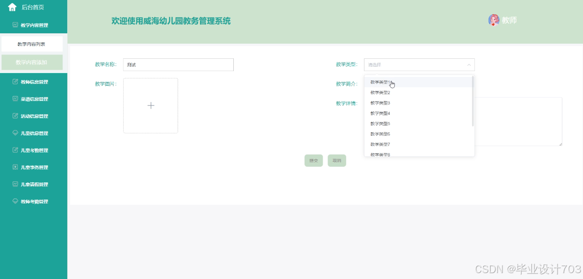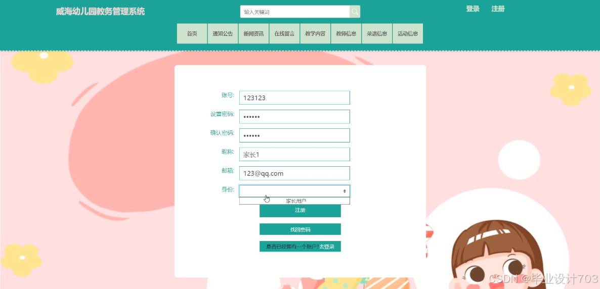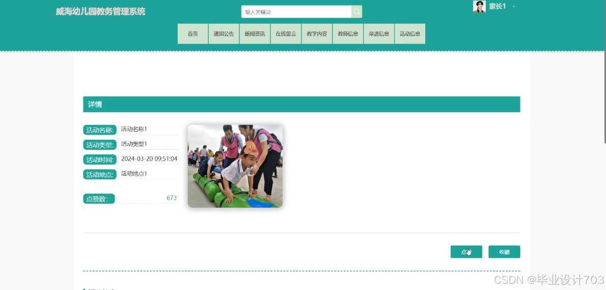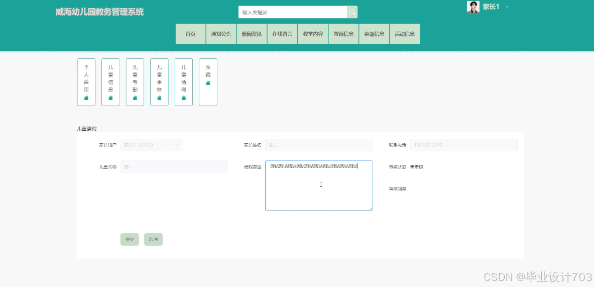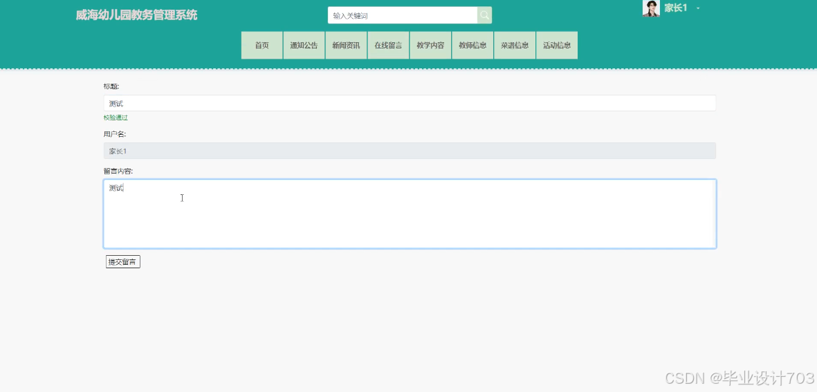 The main users of the Weihai Kindergarten Academic Management System are divided into administrators, teacher users, and parent users. The implementation functions include administrators: system users, teaching type management, teaching content management, teacher information management, recipe type management, recipe information management, activity type management, activity information management, child information management, child attendance management, child affairs management, child leave management, teacher attendance management, system management, message management, notification announcement management, resource management, etc. Teacher users: teaching content management, teacher information management, recipe information management, activity information management, child information management, child attendance management, child affairs management, child leave management, teacher attendance management, etc. Parent users: homepage, notification management, teacher attendance management, etc. Announcements, news, online messages, teaching content, teacher information, recipe information, activity information, my account, personal center, and other functions. Due to the comprehensive design of the functional modules on this website, the information management process of the entire Weihai Kindergarten educational management system can be realized.