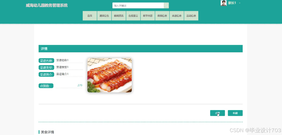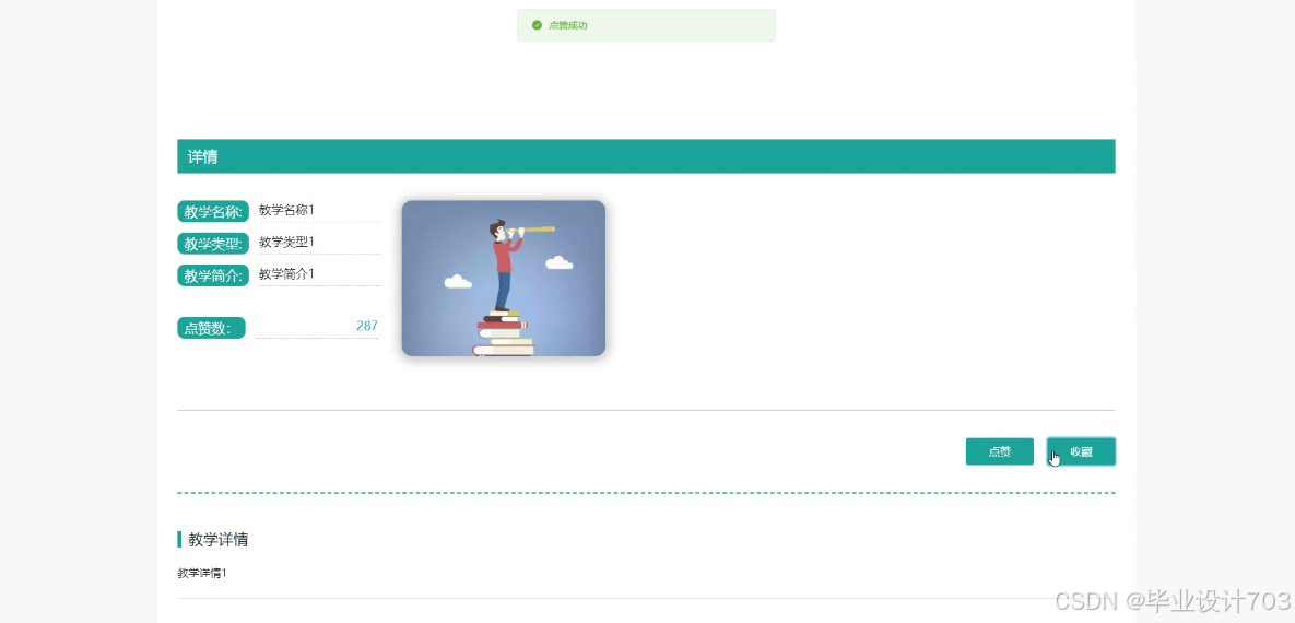 当用户点击前台“教学内容”按钮后就可以看到所有的教学内容列表,选择你想要了解的教学内容信息后将会进入该教学内容信息的详情界面,可以了解到教学名称、教学类型、教学简介、教学详情等信息,可以点赞、收藏和评论,教学内容详情界面如下图4-7所示。