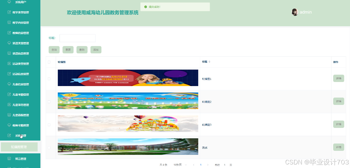 威海幼儿园教务管理系统中的管理人员在“系统管理”这一菜单下是可以对威海幼儿园教务管理系统内的轮播图进行添加修改的,其管理界面如下图4-14所示。