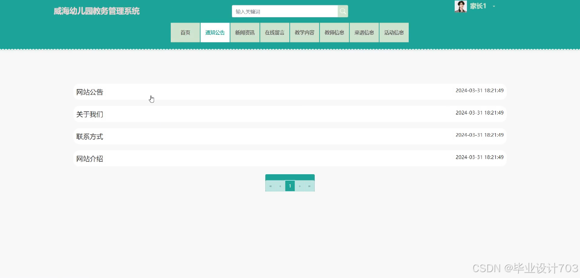 当访客点击威海幼儿园教务管理系统中导航栏上的“通知公告”后将会进入到该“通知公告”列表的界面,然后选择想要看的通知公告,点击进入到详细界面。通知公告列表展示界面如下图4-4所示。