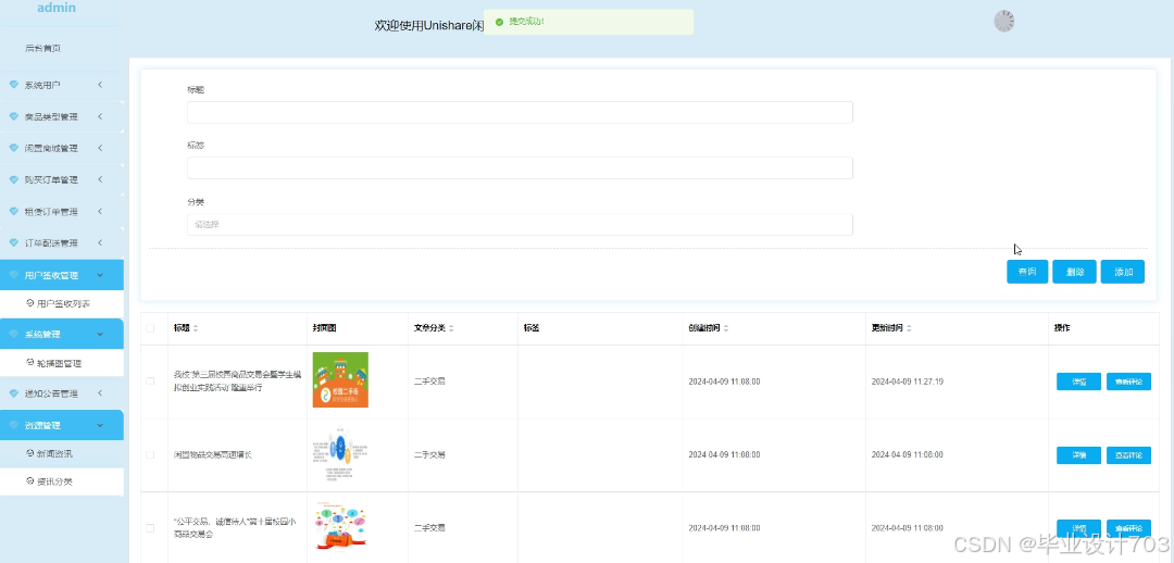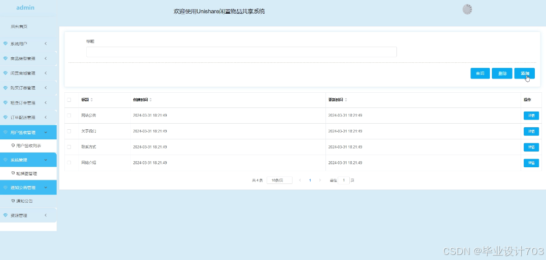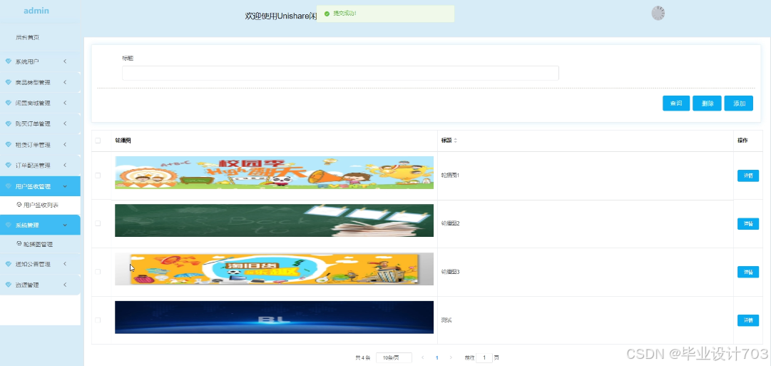 - 系统管理:管理员可以对首页的轮播图进行管理和查阅信息详情内容,进行增删改查操作,支持标题搜索。