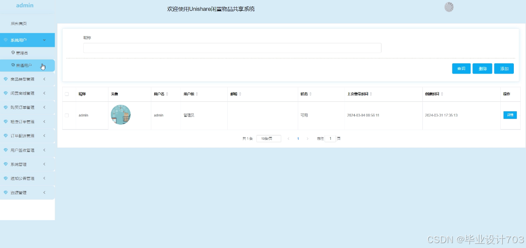 - 系统用户:管理员可以对普通用户和管理员等新系统用户信息进行管控,可以查看系统用户信息详情内容,进行增改删查操作。