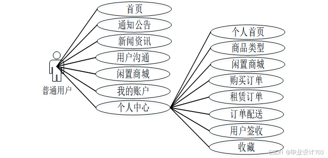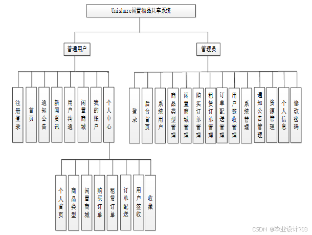 本Unishare闲置物品共享系统通过对用户的需求分析,可以分为普通用模块和管理员模块,以上模块又可以分成细小的功能模块。例如,普通用户可以注册登录系统,实现搜索和浏览通知公告、新闻资讯、闲置商城等信息;可在闲置商城中选择自己自己心仪和需要的物品,进行购买或租赁,并实现在线支付,提供配送服务;可以修改自己的账号信息和密码;同时可以通过系统与其他使用者进行交流沟通,添加为好友;并可以在个人中心内对自己的商品类型、闲置商城、购买订单、租赁订单、用户签收等信息进行管理,发布自己的闲置物品信息到商城中,确定自己订单的情况。而管理员则可以对系统中的信息和使用系统的用户进行管理,具体具有包括系统用户、商品类型管理、闲置商城管理、购买订单管理、租赁订单管理、订单配送管理、用户签收管理、系统管理、通知公告管理、资源管理、等方面的功能,保证系统的正常运转,方便用户及时获取信息和使用相关功能。