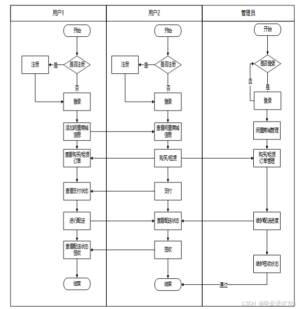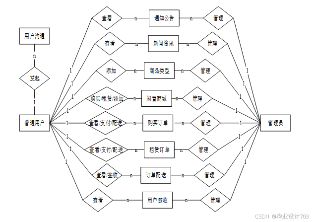 Unishare闲置物品共享系统的设计与实现主要的目的就是实现用户搜索和浏览闲置商城信息,在线购买和租赁闲置物品,并进行支付操作,享受配送服务,可签收订单;同时用户在查看其他用户发布的闲置商城信息的同时可以自己发布自己的闲置信息,并进行配送和查看签收状态。其业务流程图如下图所示。
