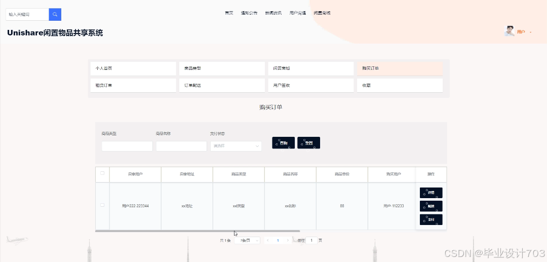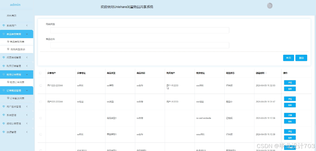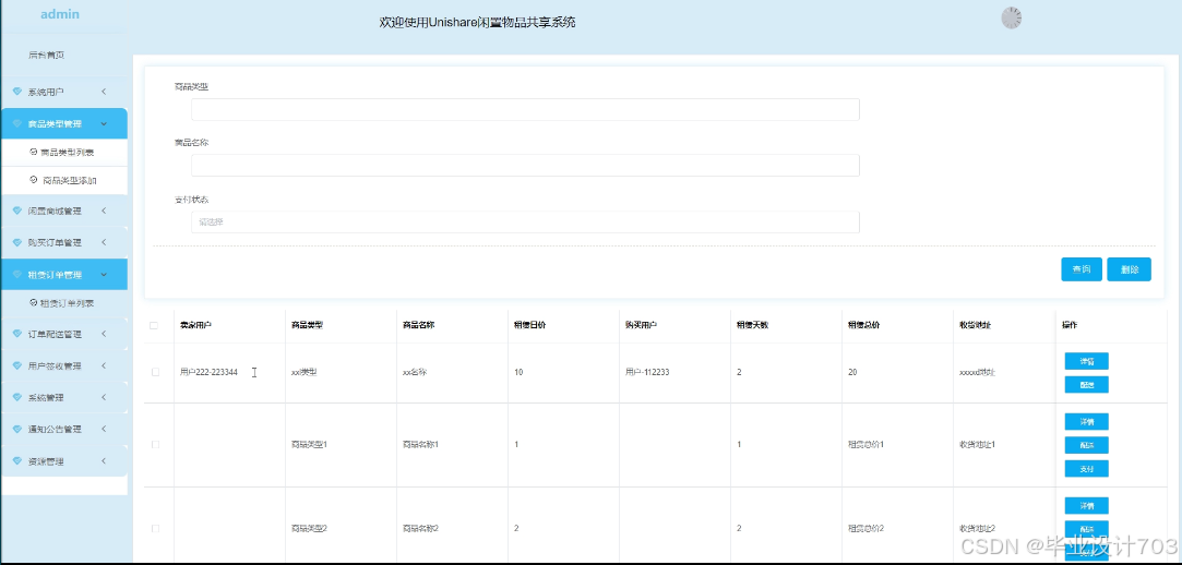 - 租赁订单管理:管理员可查看租赁订单信息详情内容,进行查询和删除操作,支持商品类型、商品名称、支付状态搜索,并可点击配送、支付操作。