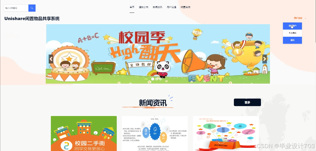 - 首页:普通用户可以查看轮播图、新闻资讯、闲置商城推荐等信息,并可以使用系统其他功能。