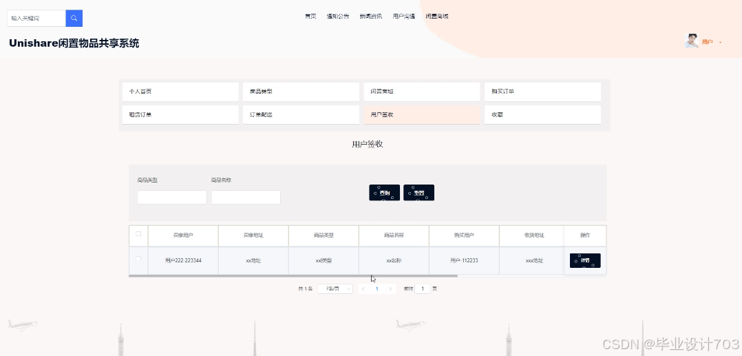 - 用户签收管理:管理员可查看租赁订单信息详情内容,进行查询和删除操作,支持商品类型、商品名称搜索。