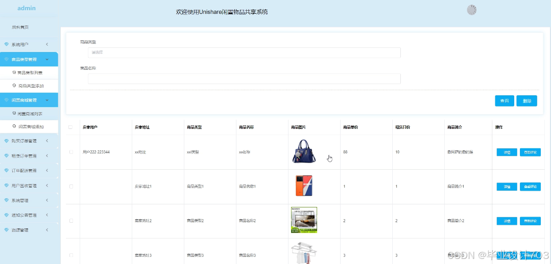 - 闲置商城管理:管理员可以查看所有闲置商城信息详情内容,进行增改删查,支持商品类型、商品名称搜索,并可以查看评论信息。