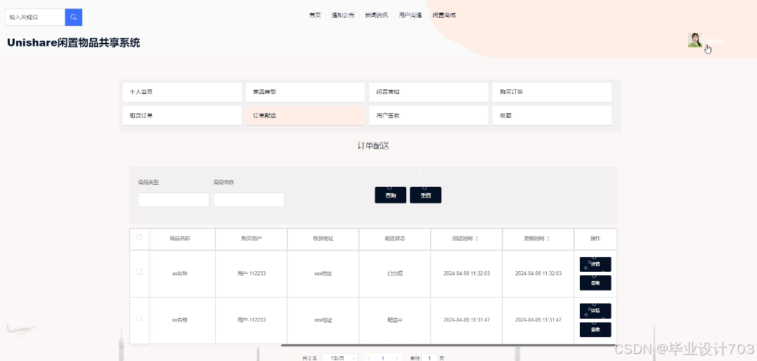 - 订单配送管理:管理员可查看订单配送信息详情内容,进行查询和删除操作,支持商品类型、商品名称搜索,并可点击签收操作。