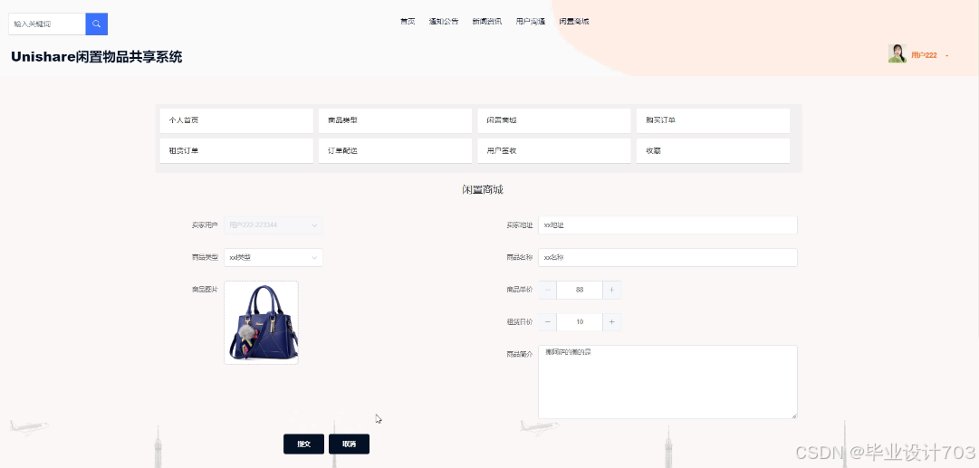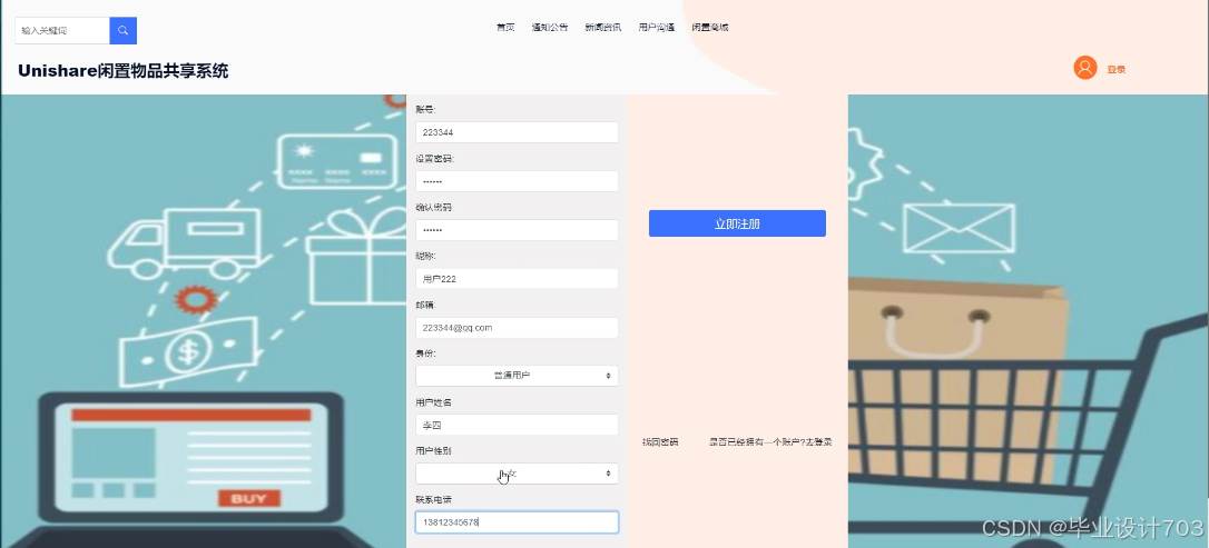 Unishare闲置物品共享系统的部署与实施,充分考虑用户的需求,提供简单易用的界面,便捷的操作流程,并进行个性化推荐,主要运行完成了用户注册、登录、首页、通知公告、新闻资讯、用户沟通、闲置商城、我的账户、个人中心(个人首页、商品类型、闲置商城、购买订单、租赁订单、订单配送、用户签收、收藏)等功能模块。该系统的研究与实现有助于闲置物品的再利用,推动共享经济的发展,促进资源的合理利用和循环利用,提升社会整体的资源利用。