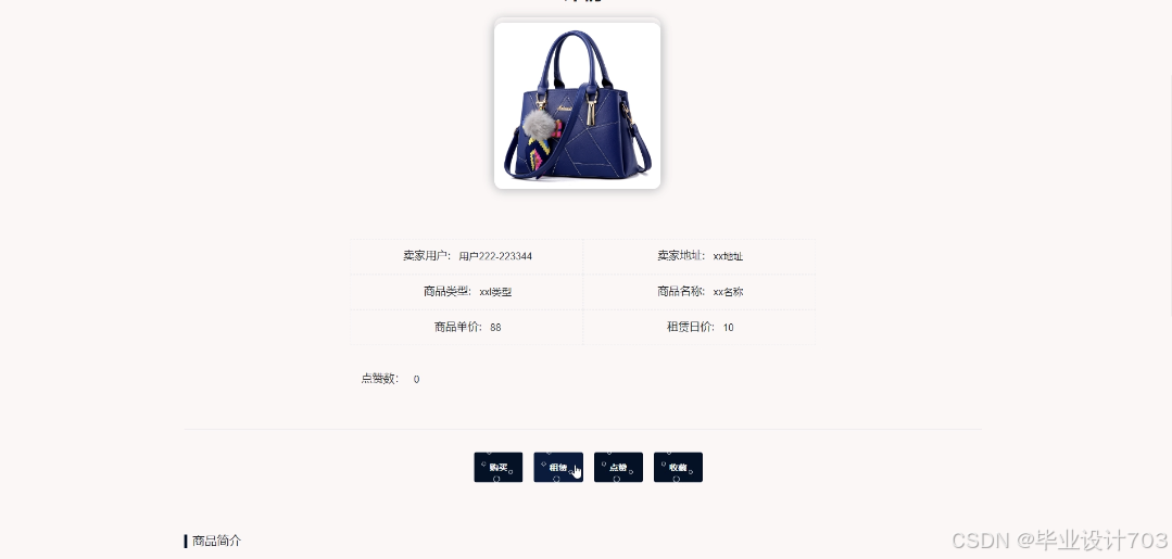 - 闲置商城:普通用户可以查看发布的所有闲置商城信息详情内容,支持商品类型、商品名称、排序搜索,可以对某一篇闲置商城信息进行点赞、收藏和评论,并可以点击购买和租赁操作。