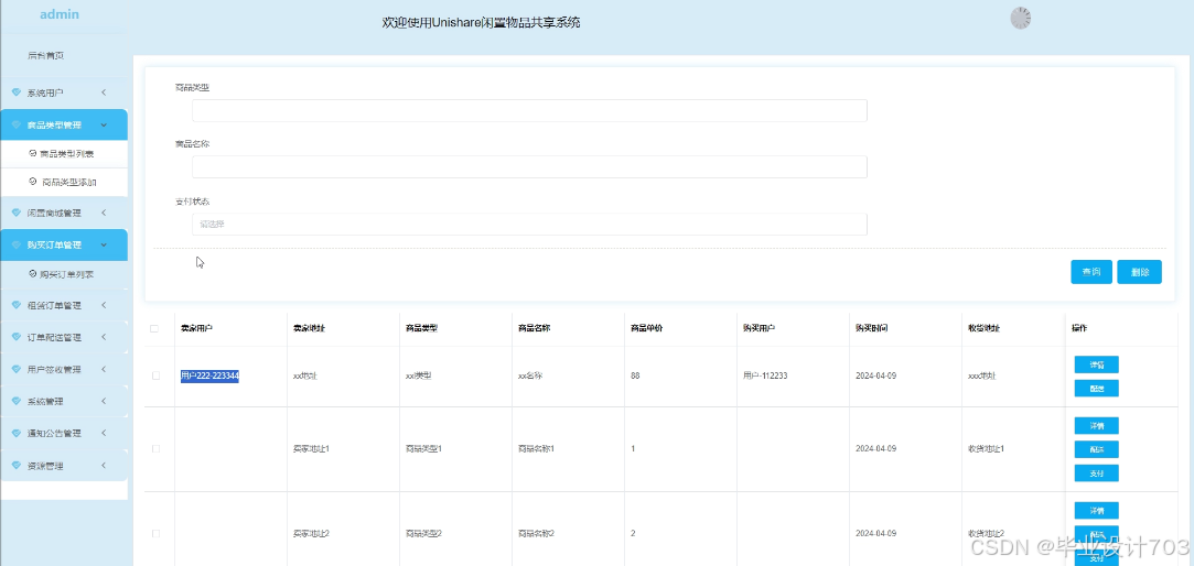 - 购买订单管理:管理员可查看购买订单信息详情内容,进行查询和删除操作,支持商品类型、商品名称、支付状态搜索,并可点击配送、支付操作。