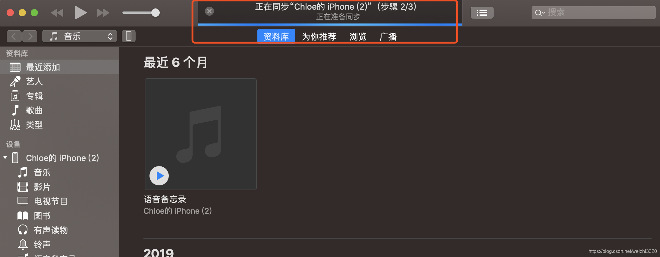 1.数据线连接macbook和iPhone,等待iTunes将iPhone数据同步到macbook中