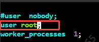 打开配置文件后,如下所示,将默认的#user nobody注释,改成user root