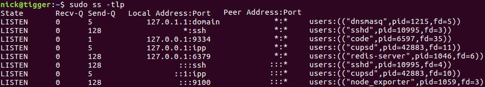 -p, –processes 显示监听端口的进程(Ubuntu 上需要 sudo)