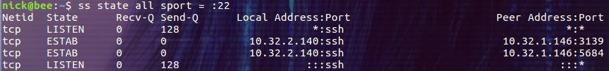 下面的命令列出所有连接到 22 端口的连接和对 22 端口的监听: