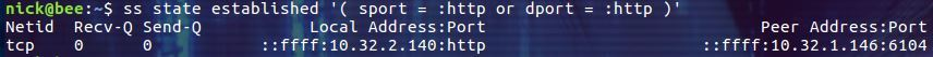 $ ss state fin-wait-1 '( sport = :http or sport = :https )' dst 193.233.7/24