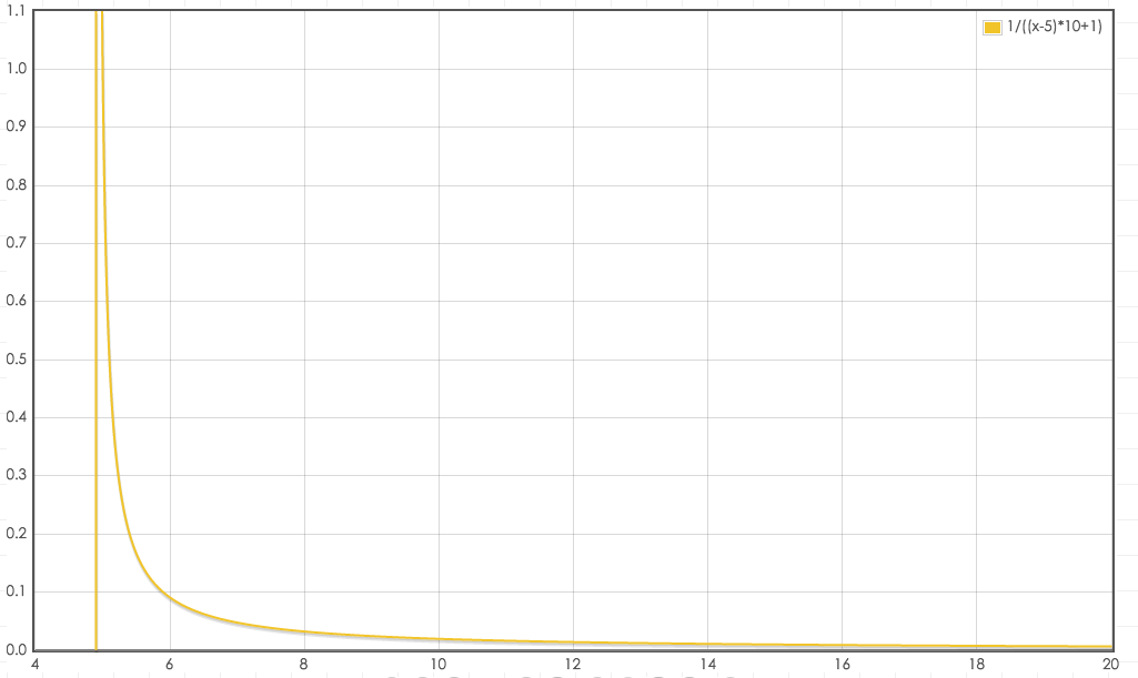 其中LFU_INIT_VAL为5,我们看下概率分布图会有一个更直观的认识,以默认server.lfu_log_factor=10为例: