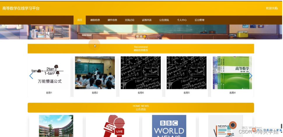 高等数学在线学习平台,在系统的首页可以查看首页、课程信息、课件管理、交流讨论、试卷列表、公告资讯、个人中心、后台管理等信息,如图5-1所示。