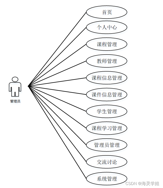 系统中的核心用户是系统管理员,管理员登录后,通过管理员菜单来管理后台系统。主要功能有:首页、个人中心、课程管理、教师管理、课程信息管理、课件信息管理、学生管理、课程学习管理、管理员管理、交流讨论、系统管理等功能。管理员用例如图3-7所示。