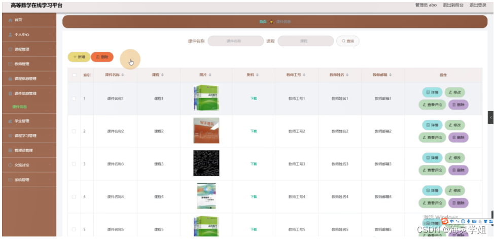 管理员登录进入自习室管理系统之后,就可以对所有的信息进行查看,可以查看到首页、个人中心、课程管理、教师管理、课程信息管理、课件信息管理、学生管理、课程学习管理、管理员管理、交流讨论、系统管理等,并且还可以对其进行相应的操作管理,如图5-8所示。