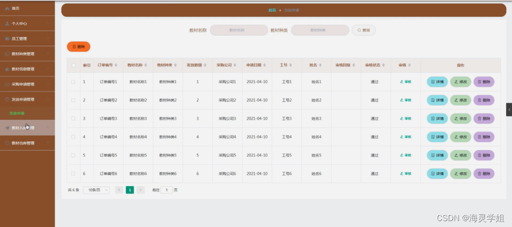 发放申请管理,在发放申请管理页面可以查看索引、订单编号、教材名称、教材种类、发放数量、采购公司、申请日期、工号、姓名、审核回复、审核状态、审核等信息,并可根据需要进行详情、修改或删除等操作,如图5-7所示。