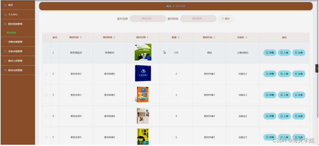 教材信息管理,在教材信息管理页面可以查看索引、教材名称、教材种类、教材封面、数量、教材作者、出版社等信息,并可根据需要进行出库、入库、详情等操作,如图5-12所示。