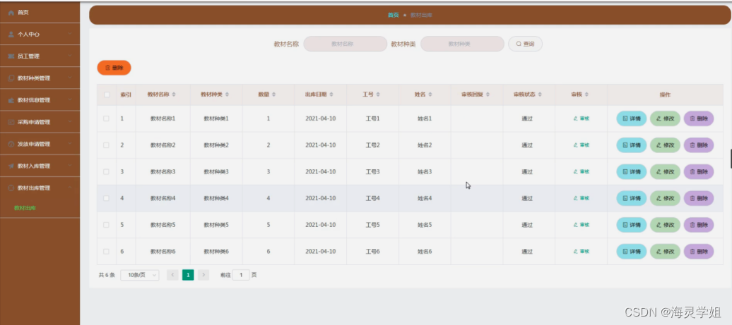 教材出库管理,在教材出库管理页面可以查看索引、教材名称、教材种类、数量、出库日期、工号、姓名、审核回复、审核状态、审核等信息,并可根据需要进行详情、修改或删除等操作,如图5-9所示。