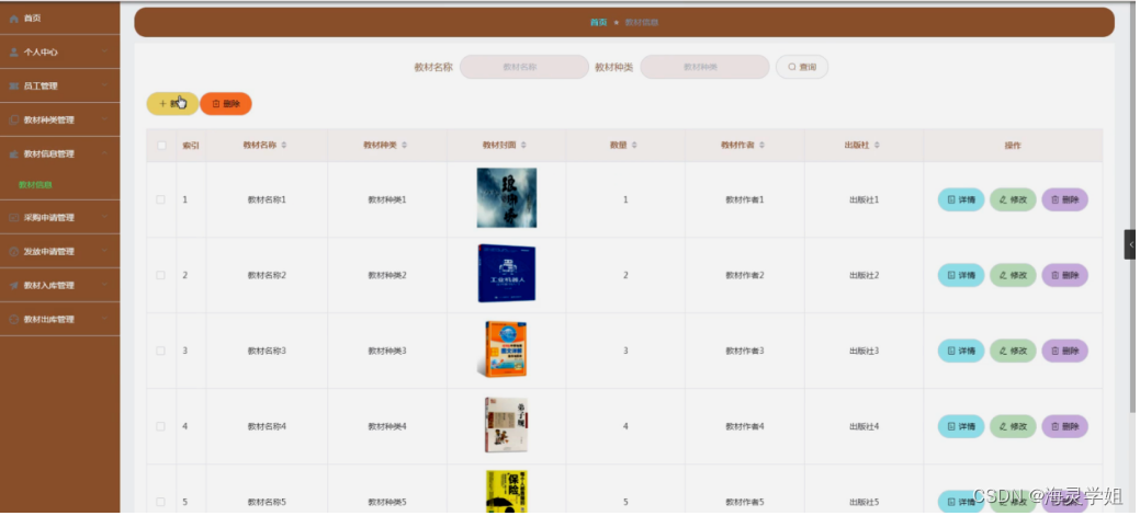 教材信息管理,在教材信息管理页面可以查看索引、教材名称、教材种类、教材封面、数量、教材作者、出版社等信息,并可根据需要进行详情、修改或删除等操作,如图5-5所示。