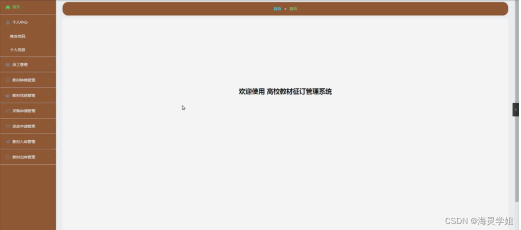 员工登录进入高校教材征订管理系统可以查看首页、个人中心、教材信息管理、采购申请管理、发放申请管理、教材入库管理、教材出库管理等信息,如图5-10所示。
