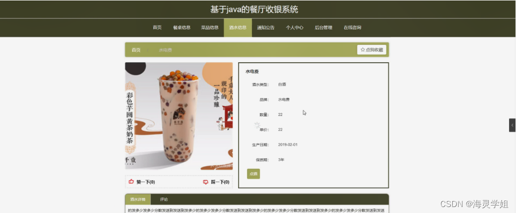 酒水信息,在酒水信息页面可以查看酒水名称,酒水类型,图片,品牌,数量,单价,生产日期,保质期,酒水详情等内容,并根据需要进行点酒,评论和收藏操作;如图5-5所示。